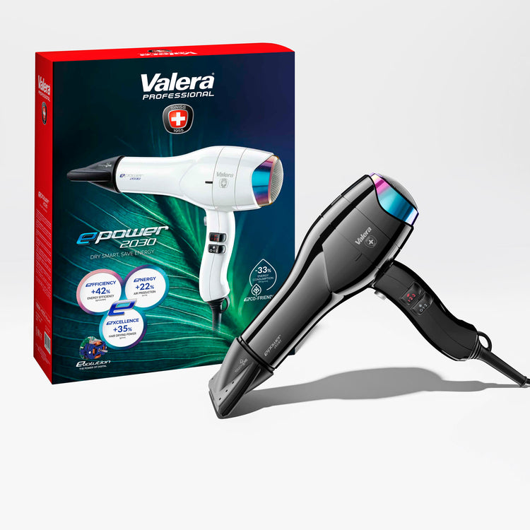Le sèche-cheveux ePower2030, respectueux de l'environnement et consommant peu, allie la puissance de séchage et les performances de coiffage professionnelles à la durabilité. Ses excellentes performances, sa faible consommation d'énergie et la grande longévité de son moteur (jusqu'à 10 000 heures) séduiront tout autant les coiffeurs-stylistes professionnels que les particuliers exigeants. Sa forme allongée permet de nombreuses possibilités de prise en main du sèche-cheveux. Il peut être tenu confortablement par sa poignée ergonomique, mais aussi par le tube qui ne chauffe pas, ou au niveau du moteur. L'ePower 2030 eQ garantit un séchage-coiffage professionnel doux pour l'environnement.