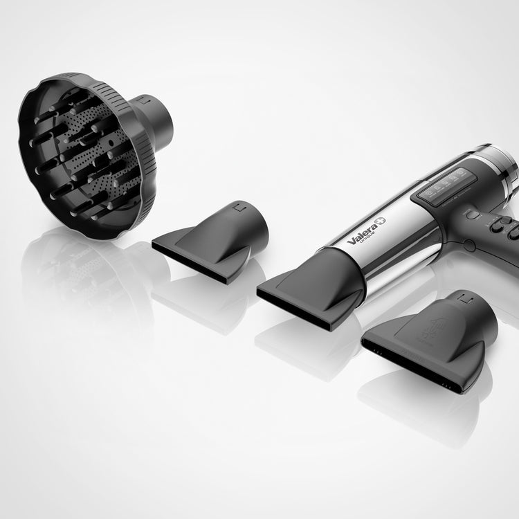 - 4 accessori: 2 bocchette di precisione (larghe 6,2 e 7,5 cm), bocchetta fredda TOUCH ME (larga 8,2 cm), diffusore per ricci (ø 12,7 cm)